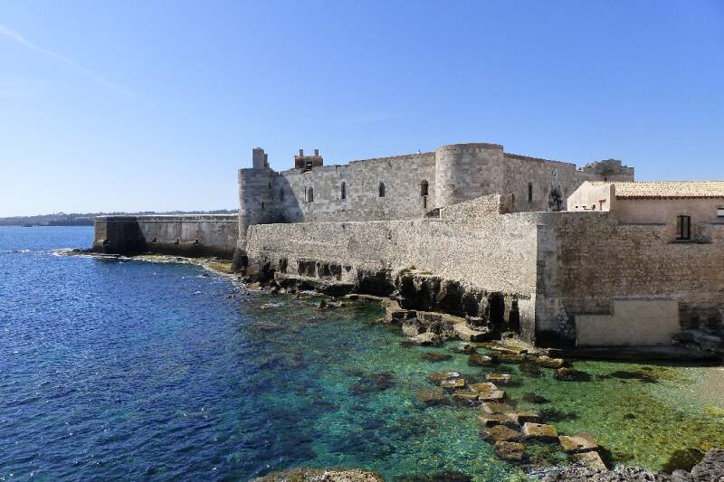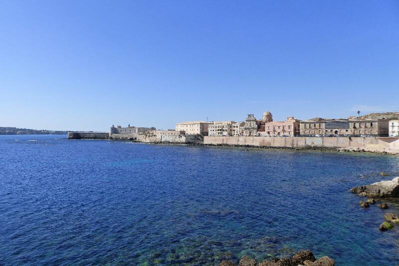 Ce matin, c’est Salvo qui nous conduit dans son minibus jusqu’à Syracuse sur l’île d’Ortigia. En arrivant sur l’île à lieu un marché, tant bien que mal notre chauffeur se gare en troisième file, chose coutumière ici et nous demande de le suivre, en fait il nous amène dans une échoppe pour nous faire goûter de la Ricotta chaude, à 9h30 du matin cela est déroutant mais si elle avait été froide peut être l’aurons nous mieux appréciée. Cette dégustation terminée nous profitons du marché qui encore une fois est très bien achalandé. Un peu plus loin nous arrivons sur les ruines du temple d’Apollon. Nous empruntons le corso Matteoti où s’aligne d’élégantes boutiques et arrivons à la Fonte Aretusa. En arrivant sur la piazza duomo, une cérémonie de la polizia tout en apparat, se déroule, nous décidons de passer notre chemin et reviendrons plus tard. Nous prenons la direction de la pointe la plus au sud de l’ile jusqu’au fort Vigliena, de là nous avons une belle vue sur Ortigia. Pour découvrir les lieux nous marchons dans diverses petites rues pour y découvrir des palazzio au style baroque. Ce soir nous stationnons face à Cassagrande del Cassibile, des gorges où se trouvent des cascades et des bassines d’eau translucide.