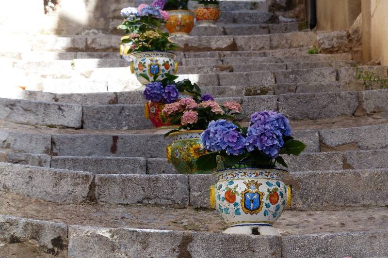 Aujourd’hui zoom sur Caltagirone, le fief de la céramique sicilienne. Ici elle est omniprésente dans la cité, que se soit les panneaux de rues, les contre marches des escaliers, les façades de certains palazzio, les barrières de ville, de décor sur un pont ou de kiosque à musique dans le parc. La spécialité est avant tout les têtes baroques en pot de fleurs mais aussi en décoration et les pommes de pin, mais également des plats, des services à vaisselle, des objets de déco, des sapins de noël et tant d’autres choses au gré des inspirations de ces artisans céramiste, en tout cas un vrai régal pour les yeux et on ne s’en lasse pas.