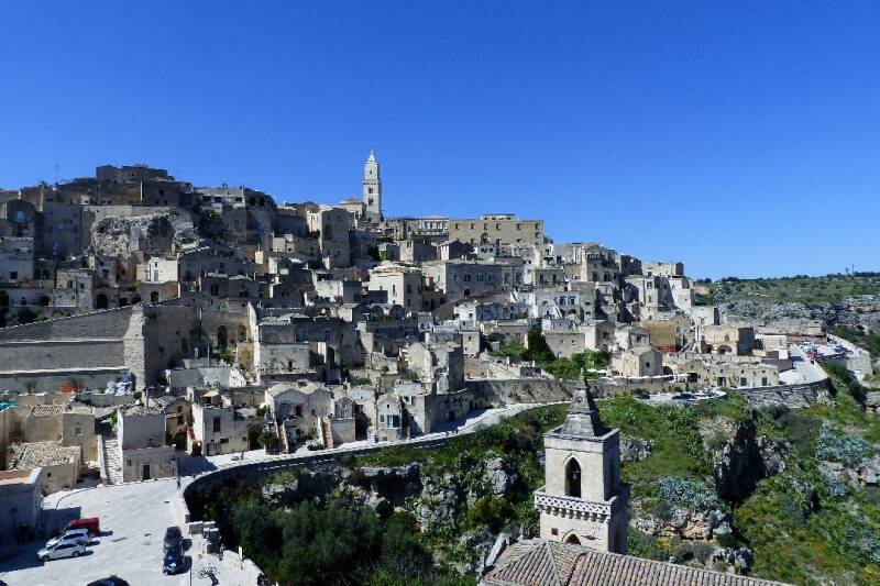 Hier soir nous avons eu droit à la soirée discothèque du camp de jeunes qui se trouvait juste à côté, mais à 10h30 extinction des feux et ensuite une nuit tip top, jusqu’au réveil à 7h30 avec une musique militaire italienne, c’est ça aussi les joies du sauvage, on ne sait jamais ce qui peut nous attendre. Ce matin nous faisons la route des ravins d’argile, au départ la route est belle puis nous commençons à apercevoir des collines d’argile ravinées, puis nous tournons sur droite direction San Arcangelo et là le décor change, nous sommes entourés par ces collines c’est fabuleux. La route plus loin se transforme puisqu’elle se réduit en largeur sans bas-côté, même l’herbe gagne sur le bitume et elle s’élève dans des lacets successifs jusqu’à nous faire traverser Alianello, village complètement déserté, dû à sa situation sur un piton d’argile avec les risques d’éboulement possible. Nous continuons notre traversée en direction d’Aliano et là route s’élève encore et nous serpentons le long des ravins d’argile, le spectacle est grandiose. Ensuite nous redescendons en empruntant une route avec des pans de route écroulés et d’autres en cours de l’être mais tout cela signalé par des panneaux ou réglementé par des feux, nous avons l’habitude maintenant. Nous allons même emprunter la route qui nous mène à Craco où sur une centaine de mètre la route est devenue un chemin de terre. Craco a été abandonné il y a une quarantaine d’année, suite à des glissements de terrain répétés, tremblements de terre, infiltration d’eau et erreurs humaines. Craco est devenue aujourd’hui une ville fantôme, inscrite depuis 2010 sur la liste des sites à sauvegarder par le Fonds mondial pour les monuments. Cet après-midi visite de Matera, classée au patrimoine mondial de l’UNESCO en 1993 pour ses Sassi, exemple le plus intact et le plus remarquable d’habitations troglodytes en région méditerranée. Le centre historique surplombe un profond ravin qui traverse le territoire sur 20 km et au duquel s’écoule une rivière. Cette cité serait une des plus vieilles au monde. Nous sommes tombés sous son charme et avons été émerveillés par la beauté intact de cette ville.