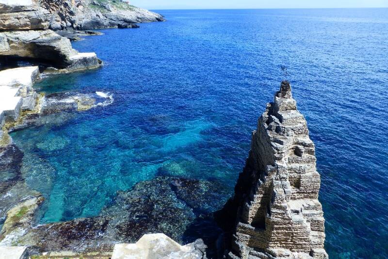 Un moustique a perturbé notre nuit. Après avoir discuté avec les Français de la région nantaise et avec qui nous avons partagé le parking au bord de mer, nous traversons Santa Maria Di Leuca jusqu’à son phare, là où la mer Ionienne et l’Adriatique se rejoigne. Le point de vue nous permet d’avoir un plan large sur la petite ville. Nous poursuivons notre chemin et là nous sommes obligés dans un premier temps de faire demi-tour et ensuite de faire un grand détour pour rejoindre Marina Serra mais la récompense va être belle. En effet nous découvrons des piscines naturelles avec une eau cristalline et dominées par la Torre Palane. Il faut dire que ce côté de littoral est très découpé, avec des falaises et une eau qui passe par toutes les teintes de cristalline à un bleu azur très soutenu, le coup d’œil vaut vraiment le coup. Au hasard de notre route à Santa Cesarea Terme, nous découvrons d’autres piscines, mais qui elles ont été crées par les romains. Avant d’arriver à Otranto nous faisons un arrêt à Cava Di Bauxite pour voir un lac aux eaux émeraude, contrastant avec la couleur ocre des monticules de cette ancienne carrière de Bauxite. Pour terminer notre journée nous déambulons dans le centre historique d’Otranto après être passé devant le château Aragonais du 15ème siècle. La cathédrale est aussi très exceptionnelle, avec une fresque toute en mosaïque sur toute la surface centrale de l’édifice représentant l’arbre de vie et en son sous-sol une chapelle atypique. Nous avons apprécié ce petit centre, très bien restauré et propre avec une atmosphère presque Grecque.