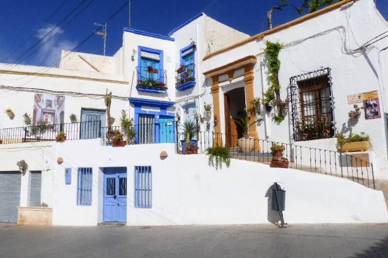 Ce matin l’humeur n’est pas au rendez-vous, en effet de drôles de personnages sont venus poser leurs caravanes sur l’aire alors que le jour n’était pas levé, en plus ils ont bricolé dessus pour bien nous réveiller. En prenant la route qui nous mène à Aguilas, nous apercevons au loin les nuages gris, tant pis pour nous il va faire plus frais. Sur la route nous commençons à voir nos premières cultures intensives sous serres plastiques. Nous arrivons à nous stationner sur le bord de mer afin de profiter de la vue sur la baie d’Aguilas avec le château sur son piton rocheux, comme il ne pleut pas nous marchons sur le bord de mer jusqu’au centre ville où il n’y a rien de spécial juste une station balnéaire toute simple. Pour la pause de midi nous nous garons sur un parking en terre de bord de plage, en fait il est squatté par une tribu d’Allemand qu’on a eu le sentiment de déranger, une fois notre collation prise nous sommes repartis, tellement nous avons eu un bon accueil. Notre après-midi va être consacré à la visite de Mojacar notre premier village blanc perché sur un flan de montagne, en plus le soleil est de retour.