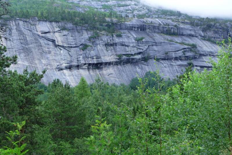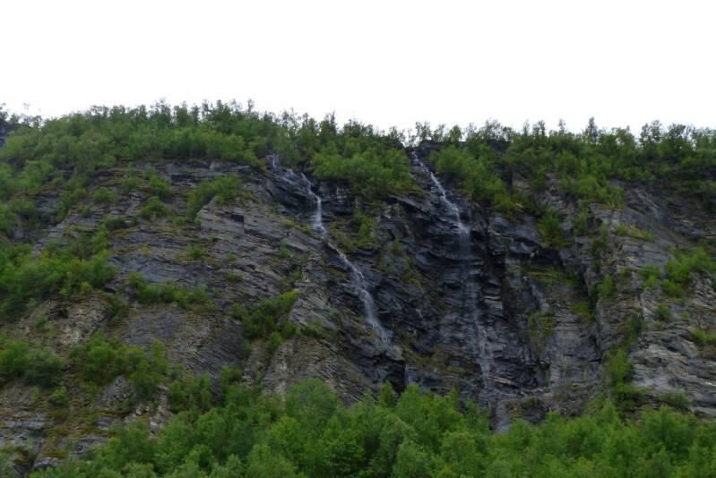 Samedi 23 juillet, ce qui devait être une journée de transition, s’est transformée en journée grandiose. En effet dès notre départ d’Oppdal nous commençons à apercevoir des cimes partiellement enneigées et plus on avance plus les pics s’élèvent jusqu’à osciller entre 1500 et plus de 1700 mètres cela nous offre un décor magnifique et comme cela ne suffit pas, des cascades dévalent les pentes de ces géants toutes plus hautes les unes que les autres jusqu’à celle de Vinnu. Cette cascade a pour origine le glacier du même nom et est la plus haute de Norvège mais elle est aussi la cinquième plus haute cascade du monde. Elle mesure approximativement 860 mètres de haut avec une chute en aplomb d’environ 150 mètres. Nous avons pu monter jusqu’au plus bas des paliers à environ 450 mètres, grâce à une petite randonnée un peu ardu, mais qui en valait la peine. La route qui nous mène d'Oppdal jusqu’à Kristiansund nous a émerveillé toute la journée et pourtant elle ne fait pas partie des routes à voir absolument et pourtant elle mériterait d’y apparaître.