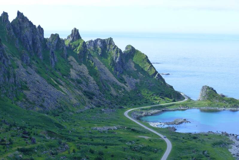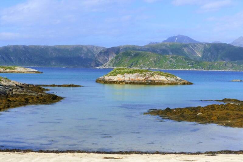 Dimanche 3 juillet, nous allons finir le tour de l’île de Hadseloya, toujours pour rejoindre celle de Andoya et sillonner la route panoramique du même nom. Ces deux îles font partie des Vesteralen qui comprend également celle de Hinnoya. Sur la route touristique nous croisons plus de camping-car que de voitures, le ruban emprunté est sinueux, nous sommes entre mer et montagne et le décor est merveilleux. Pour tout voir il faudrait avoir des yeux de tous les côtés. Sur le parcours le petit village de Bleik a retenu notre attention avec sa plage de sable blanc, ses eaux turquoises et son îlot juste en face, une vraie carte postale. Ce soir nous avons atteint les 12000 kilomètres tout juste depuis notre départ, nous pensons être approximativement au milieu du parcours en distance et également en terme de durée.