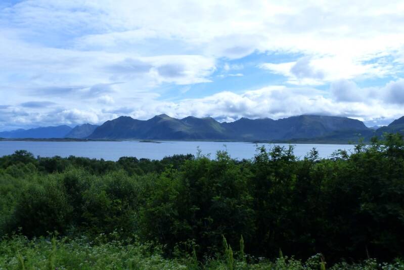 Mercredi 29 juin, la nuit a été très chaude, ce matin il fait plus de 30° degrés dans le fourgon et pourtant le lanterneau avant est resté ouvert. Nous reprenons la suite et fin de la route panoramique de Senja et faisons demi-tour vers les îles Vesteralen. Sur notre chemin nous sommes arrêtés à l’occasion de travaux de voirie et ici nous pouvons dire qu’il y en a beaucoup. La particularité pendant ces interventions c’est qu’il n’y a pas de feu de circulation comme en France, mais un véhicule « suivez-moi » ou en Norvégien « Folg meg » qui fait la navette entre les deux extrémités du chantier pour prendre les véhicules circulants en charge. A la sortie de Bardu se trouve le musée de plein air avec des maisons en bois datant de 1860 à 1875. Un peu plus loin nous apercevons une cascade avec un fort débit, clignotant à gauche, un coup de volant dans le même sens et sur la petite route un parking avec un petit sentier pour nous y amener. Le sentier est court, il nous permet d’aller au pied, voire de monter jusqu’en haut de la cascade et vu la chaleur du jour cette petite balade est bien rafraîchissante. En reprenant la route nous comprenons ce qu’est qu’un changement de temps en Norvège, puisque de 29° nous tombons à 14° et cela en quelques kilomètres, nous essuyons des trombes d’eau et quelques dizaines de kilomètres plus loin nous retrouvons le soleil mais un vent très soutenu.