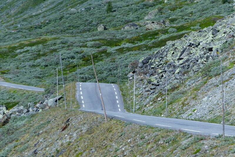 Lundi 25 juillet, après avoir été bercé toute la nuit par le bruissement du torrent tout proche et réveillé au son des cloches du troupeau de mouton pâturant dans le coin. Nous reprenons la route là où nous nous sommes arrêtés hier soir, c’est à dire en haut des lacets. Nous avons encore vécu une journée merveilleuse sur cette route 63 et roulé sur des routes encore plus vertigineuses. Sur la route qui descend du col nous longeons un torrent aux eaux couleur du sirop « menthe-glacial » oui, vous voyez cette couleur bleu vert comme celle des glaciers. Tout cela pour dire que nous avons encore pris plein les yeux sans parler du fjord de Geiranger et sa descente mythique de 11 lacets à 10 %, grandiose même les paquebots gigantesques paraissent tout petit en bas. Que de décors de cartes postales nous avons traversé, encore beaucoup d’images gravées à tout jamais dans nos mémoires. Ce soir nous sommes basés au pied d’un lac à 1050 mètres d’altitude au milieu des montagnes encore bien enneigées.