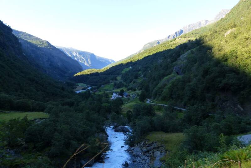 Jeudi 28 juillet, ce matin un grand soleil avec un ciel bleu azur éclaire les montagnes enneigées et nous profitons de ce moment pour prendre quelques photos avec cette belle lumière. Nous reprenons la route 55 qui tutoie les sommets avant de plonger dans une vallée encaissée puis finie par rejoindre un fjord que nous longeons avant de le traverser avec un ferry. Après la pause déjeuner nous prenons la route 5627 appelée aussi Aurlandsfjellet, et là nous empruntons une route où une seule voiture peut rouler à la fois, autant dire que c’est chaud dès qu’il faut se croiser et cela va durer 40 kilomètres. La route est très sinueuse et longe un torrent qui s’enfonce au fond de la vallée au fur et à mesure que nous montons avant d’arriver sur un plateau où nous retrouvons neige, lac,torrent, mais ici il règne une atmosphère presque lunaire puisque rien ne pousse à part des cailloux. En commençant notre descente vers Aurland, nous nous disons que cette route n’était pas exceptionnelle mais ces paroles étaient peut- être hâtive car au détour d’un lacet nous sommes arrivé sur un point de vue et là Whaouhhh. En effet une plate forme aménagée nous permet de voir, que dis-je contempler le Sognefjord qui est le plus long fjord au monde avec en plus un temps magnifique alors nous ne boudons pas notre plaisir. Ensuite nous reprenons cette descente vertigineuse et toujours aussi étroite jusqu’à être obligé car coincé, d’arrêter le moteur pour faire la circulation afin de pouvoir désengorger l’afflux de véhicules montant cela se jouait au cm près, pour enfin à mon tour reprendre la descente puis direction Flam. Cette petite commune est situé au fond d’un fjord et à son port un bateau de croisière gigantesque était amarré mais nous ne sommes pas venu pour ça mais plutôt pour prendre le train qui est un des plus beaux du monde. Cette ligne ferroviaire à été inauguré en 1940, elle à une distance de 20 kilomètres, la pente est de 55 %. La vallée que nous traversons n’est possible uniquement par ce mode de transport où le vélo et vraiment ce décor est fabuleux. Afin d’atteindre notre spot du jour nous avons dû emprunter un tunnel de 25 kilomètres qui remplace la petite route sinueuse que nous avons emprunter cet après-midi.