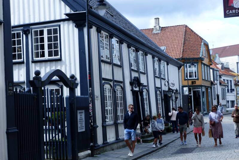 Vendredi 5 août, ce matin nuages et soleil au petit-déjeuner de quoi nous mettre de bonne humeur. Pour nous rendre à Stavanger toute proche, nous empruntons le tunnel sous-marin le plus profond du monde d’une distance de 14,400 kilomètres. Une fois stationné à la marina nous prenons la direction du port pour voir s’il y a encore des places pour une éventuelle mini croisière sur le Lysefjord. Bingo il reste de la place avec un départ à 12h15, juste le temps d’aller acheter un casse-croûte et hop nous montons dans notre bateau à grande vitesse pour une durée de 2h45. Sur le chemin aller le commandant de bord prend le temps de s’arrêter à toutes les étapes prévues et nous avons même droit à des commentaires en Français, chose exceptionnelle en Norvège, il n’hésite pas non plus à aller au bord des falaises dans le fjord à presque toucher la coque du bateau, un vrai virtuose. Nous avons pu admirer le Preikestolen vue d’en bas et l’effet de vide est encore plus impressionnant vu d’en bas et dire que j’étais dessus hier matin. A notre retour sur terre nous visitons le centre historique de Stavanger et cela a été un vrai coup de coeur, principalement cette rue avec toutes ses maisons colorées et animées.