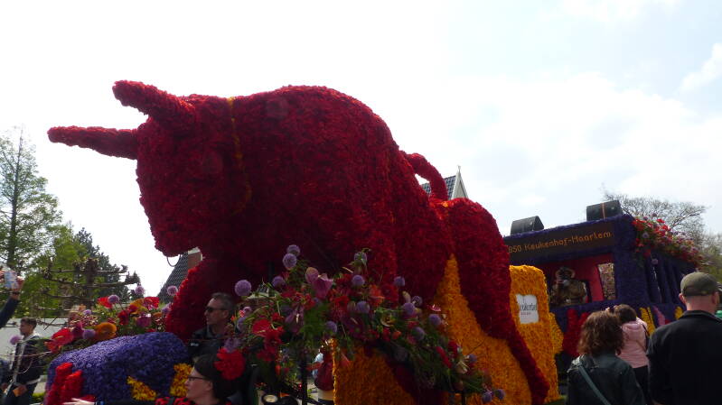 Samedi 23 avril, après une bonne nuit malgré la proximité de la route et des aéroports de Rotterdam et Amsterdam vers 10 heures nous sommes allés au centre de Sassenheim pour prendre la température concernant le défilé de chars fleuris. Nous n’avons pas eu les renseignements mais une ambiance festive régnait au sein de cette commune. En déambulant dans les rues pour essayer de décrypter par où le corso passait nous avons fini par comprendre que l’axe de circulation était orné de drapeaux Néerlandais et nous nous sommes aperçu que des parents accompagnaient leurs enfants sur des véhicules à roues fleuris vers une direction bien précise et donc nous nous sommes empressés de les suivre. Arrivé au point de ralliement une fanfare composée que d’enfants se mit à jouer devant le cortège de véhicules à roues dans tout le village. Ensuite nous avons pris une direction vers l’extérieur du village où passe le défilé et quand les premiers chars sont arrivés nous avons découvert des chars de grande facture tant par les décors réalisés qu’avec des fleurs naturelles et on vous passe les parfums que vous ne pourrez pas sentir. Les quelques photos ci-dessous vous donneront un aperçu des merveilles de ce défilé.