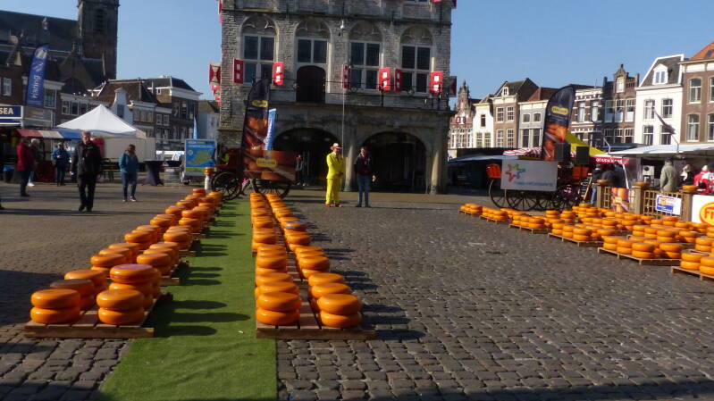 Jeudi 28 avril ce matin le soleil est radieux et c’est le jour du marché traditionnel de Gouda. En arrivant sur la place nous découvrons ces meules de Gouda de couleur orange alignées, et commençons à voir des personnages haut en couleur et d’autres en habit traditionnel, à 10 heures la cloche sonne et les ventes entre les agriculteurs fabricants et les négociants peuvent commencer. Entre ces deux protagonistes se mêle un échange de paroles et de claquements de mains jusqu’à la conclusion de la vente, ce spectacle est en nul point commun. Une meule pèse 15 kilos.