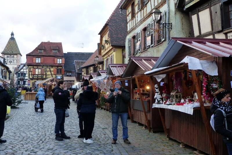 Déjà notre vingtième marché et cette fois ci ce sera à Eguisheim, village classé parmi les plus beaux villages de France. Une fois avoir pénétré dans le cœur du village nous sommes tout de suite attirés par ces belles maisons Alsaciennes mais aussi toutes ces décorations qui les mettent en valeur. Le marché se situe su les deux places du centre et comprend une trentaine d’exposants, mais une grande partie de la foule attend le veilleur de nuit sur la place du château. Nous continuons notre tour du village sans lui, car il y a trop de monde.