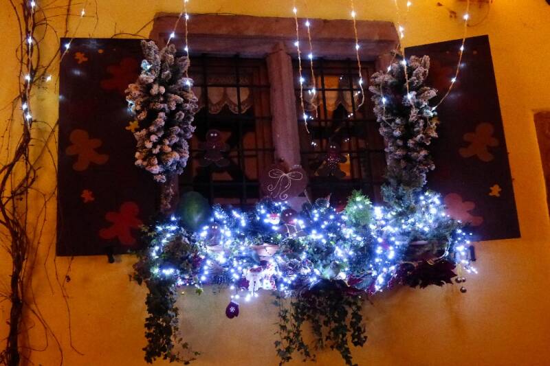 Ce matin nous repassons la frontière Française pour nous rendre à Obernai bien connu pour ses brasseries. Après avoir cherché de la place nous finissons par nous stationner sur le parking du stade, de là une voie piétonne nous amène jusqu’à l’entrée des remparts. Cette ville est magnifique, on y retrouve un vrai esprit de Noël avec ses rues illuminées, ses vitrines et façades de maisons décorées et son grand sapin sur la place principale. Nous avons également droit à une exposition de dentelles sur papier et de crèches, dont une a fait remonter des souvenirs d’enfance à l’époque ou on allait voir une crèche à la sortie de la chapelle des sœurs Marianites de Sainte-Croix.