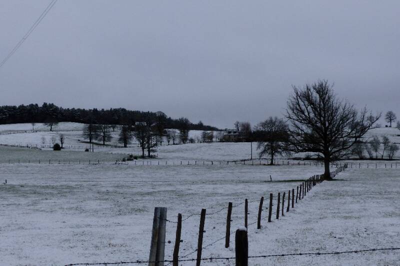 Hier soir nous bavardé assez tard et ce matin une belle surprise nous attend dehors puisqu’il est tombé 5 cm de neige durant la nuit. Le paysage est enchanté, les arbres sont parés de blanc comme si on avait déposé du coton sur les branches sur d’autres on dirait que des groupes floraux ont éclos dans la nuit.
