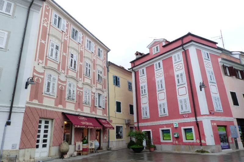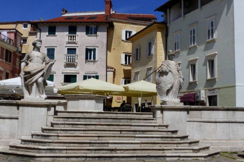 Ce matin il fait déjà bien chaud mais le ciel est tout gris et les quelques gouttes qui tombent sont chargées de ce sable du Sahara qu’on appelle Sirocco, je ne vous dis pas l’état du camion ! Cela ne nous empêche pas de passer la frontière Slovène tranquillement sans voir âme qui vive. Nous nous arrêtons dans la première ville de ce pays, Koper, qui en fait est un port de marchandises par où transitent tous les produits importés par la mer. Ce pays ne compte que 47 kilomètres de côte et 3 villes importantes sont à voir. La première sera Koper qui dans sa périphérie est une vaste zone de fret international que ce soit par voie maritime ou ferroviaire. Son centre historique est tout petit et ne compte qu’une place principale intéressante.