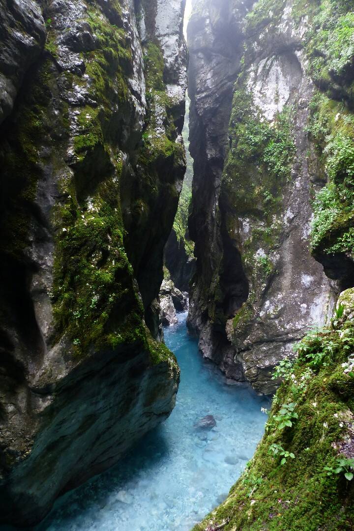 Ce matin visite des gorges de Tolmin, elles ne sont pas grandes mais quel spectacle des couleurs naturelles irréelles qui par endroit se reflète sur la roche. La confluence de la Tolminka et de la Zadlaščica marque la rencontre entre les deux rivières. Les gorges de Tolmin ne sont en effet pas formées par la rivière Soča, mais par 2 rivières qui sont des affluents de la Soča. Cette confluence marque le point le plus bas de tout le parc national du Triglav, avec seulement 180 m d’altitude. La source thermale est la partie que je préfère dans les gorges de Tolmin. C’est un filet d’eau rapide qui creuse la partie la plus étroite du canyon, avec une température jusqu’à 20,8 °C. Un tunnel vous permet d’accéder à une partie encore plus impressionnante au fond. La Tête d’Ours est une pierre suspendue dans l’étroit canyon. Elle se trouve juste avant le moment où l’on remonte au sommet du canyon, et demande de faire un détour supplémentaire un peu raide, mais court. Ne la ratez pas.